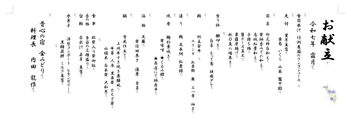 ・馬刺し 料金 2,900円 ハーフサイズ 1,900円 ・香の物盛り合わせ 1,000円 ・自家製唐墨2種食べ比べ 3,000円 ・山女魚塩焼き(1尾) 1,500円 (17:30受付終了) < 受付時間 > ご注文は19:30までとさせて頂きます。 ※仕入状況によって写真と内容が異なる場合があります。 ※ご注文は帳場(内線9番)又はお近くの従業員へお申し付けください。 ※表示料金は消費税込の価格でございます。